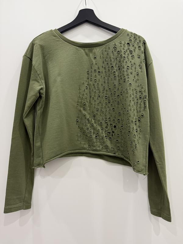 Укорочений світшот хакі з дірочками Розмір xs Під руками 50 см Довжина рукава 55 см Довжина по спині 43 см (укорочений за фасоном)