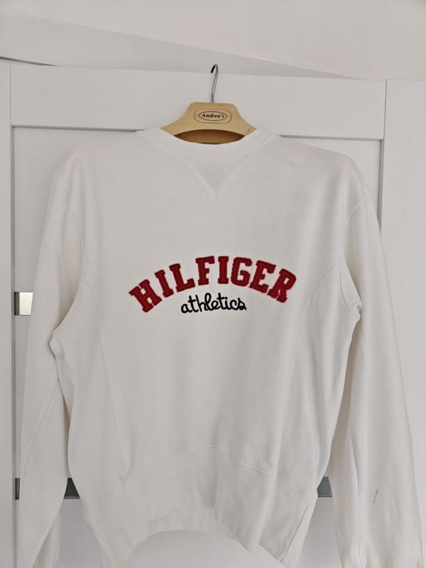 Белоснежный,котоновый свитшот Tommy Hifiger,надпись вышивка,но есть нюансы. Еле заметное пятнышко впереди и 2 пятнышка на рукаве. Смотрите фото 4 и 5.Стирать и выводить не пробовала. Думаю,что с этим можно справиться.В цене учтено.