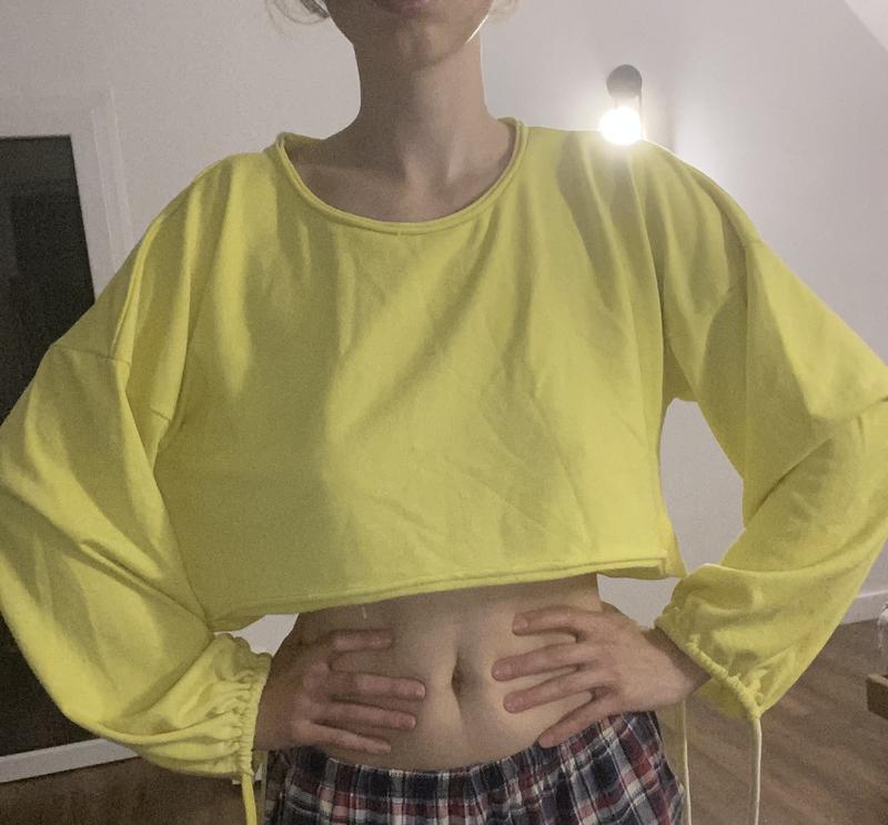 Классный топ-свитшот на лето. Особенно красиво смотрится на загарообразной коже. Имеет длинные завязки на рукавах. Имеет катышки, следует будет снимать их (см на фото).
