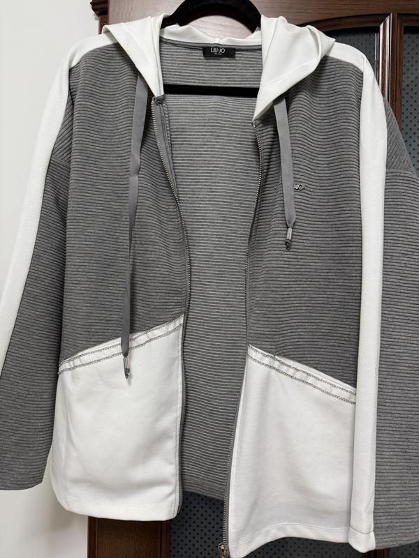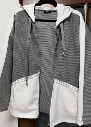 Кофта бомбер, сірого кольору в комбінації з білим . Має капішон, кармани. Довжина 67см. Ног58.