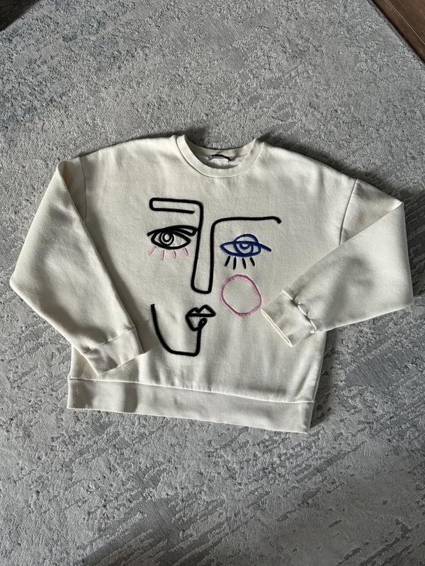 Молочний світшот зара, з вишитим обличчям, є утеплення флісове. Розмір С, сідає вільно.