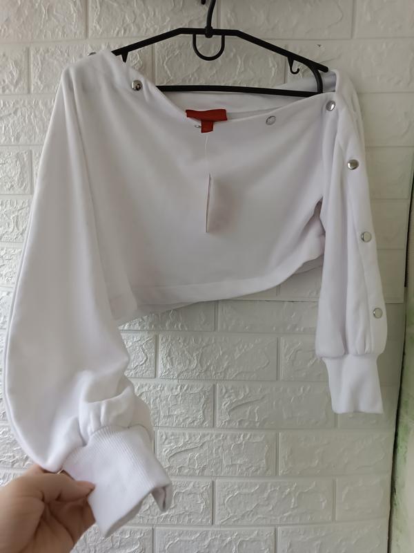 очень красивая укороченная белая кофточка с открытым плечом длина 37 полуобхват груди 54.
