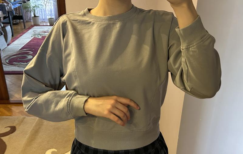 Сірий вкорочений світшот, з манжетами, в хорошому стані. Пів-ОГ- 60 см Ширина манжету- 43 см Довжина від плеча- 51 см Довжина рукава від горловини - 68 см За додатковою інформацією/фото звертайтесь в приватні повідомлення))