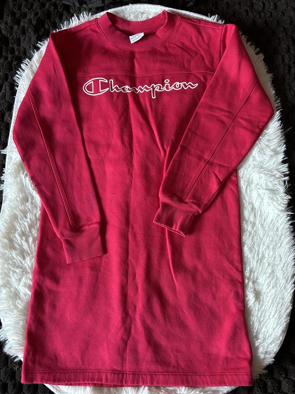Стильна жіноча сукня-світшот у спортивному стилі від бренду Champion. Виконана з приємного до тіла бавовняного матеріалу, має насичений малиново-червоний колір. Довгі рукави з еластичними манжетами та круглий виріз горловини забезпечують комфорт у носінні. Спереду розташований фірмовий логотип Champion білим кольором, що додає виробу впізнаваного брендовго стилю. Довжина 78 см Рукав 55 см від плеча Груди і талія 43 см півобхват вільний прямий крій