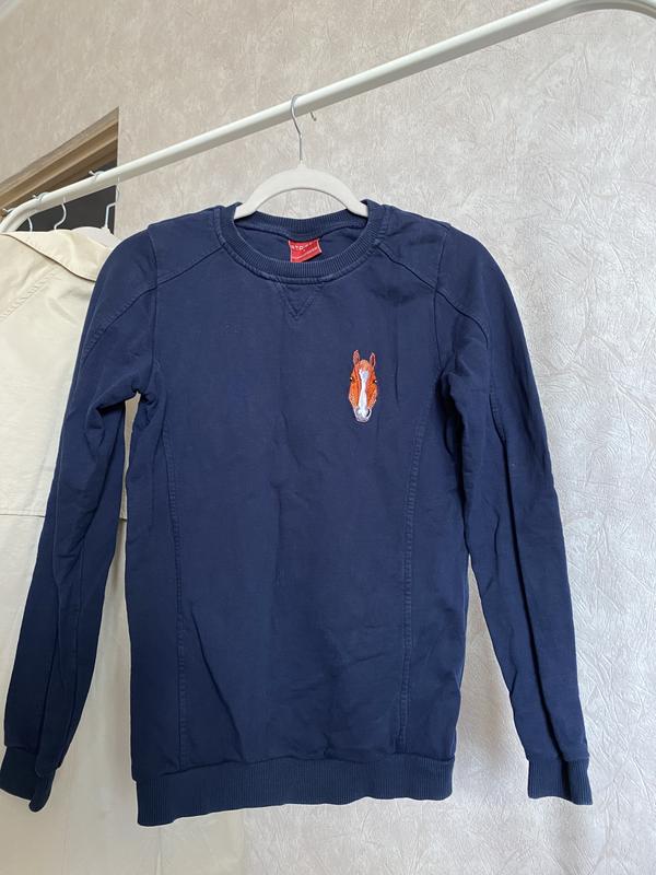 Кофтинка для кінного спорту в синьому кольорі з вишивкою рудого коня спереду та ззаду, розмір S