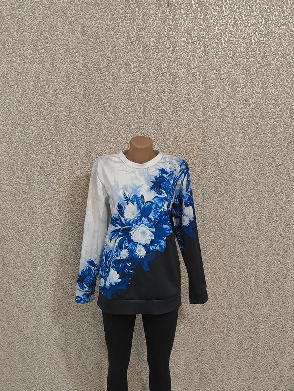 світшот в квітковий принт в гарному стані, є невеличкий непримітний нюанс ,видно на останньому фото. плечі 42 см груди напівобхват 53-63 см довжина рукава від плеча 61 см довжина 68 см матеріал: поліестер