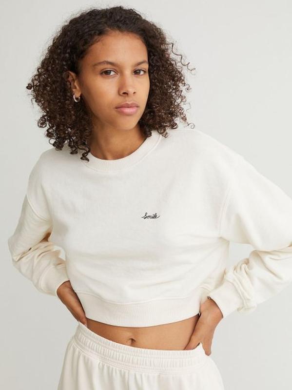 Укороченный топ из мягкой ткани для свитшота с небольшой вышитой деталью в верхней части. Круглый вырез горловины, спущенные плечи и длинные рукава. Ребристая отрезка по вырезу горловины, манжетам и низу. Довжина: Укорочена 48 см. Длина рукава: Длинный рукав Посадка: Обычный крой Стиль: Свитшот Вырез горловины: Круглый воротник Описание: Цвет Кремовый Надпись: Smile/ Улыбка Материал: Френч-терри Хлопок, полиэстер Страна производства: Бангладеш