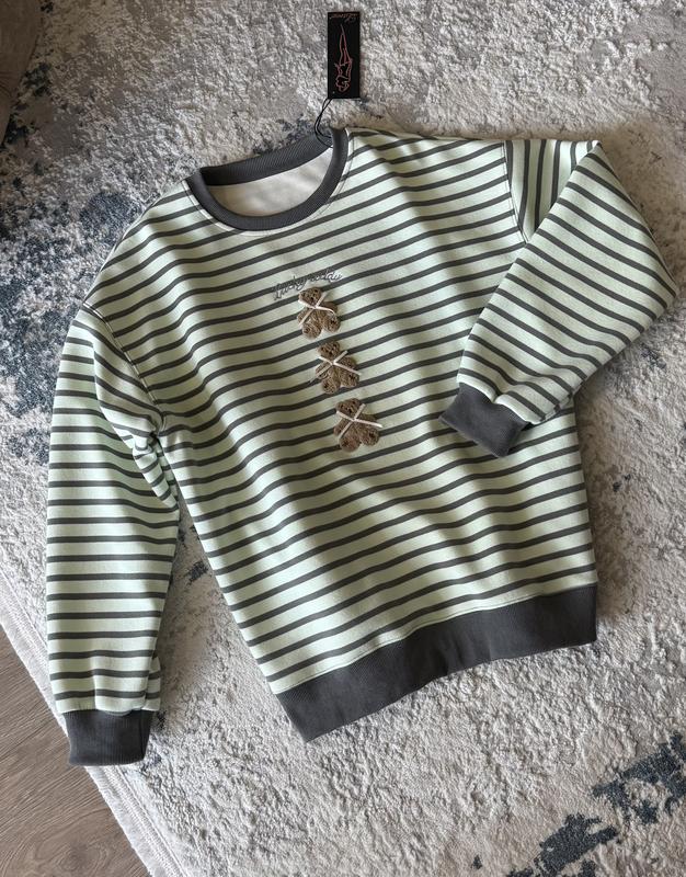 В наявності дуже зручний теплий та комфортний світшот Оверсайз стиль . Розмір універсальний. Колір фісташковий у смужку Довжина 65 см Напів обʼєм грудей 56 см Туреччина. Якість дуже гарна. Аплікація з ведмедиками. Склад тканини (65%котон/ 35%поліестер) Не кашлатиться .