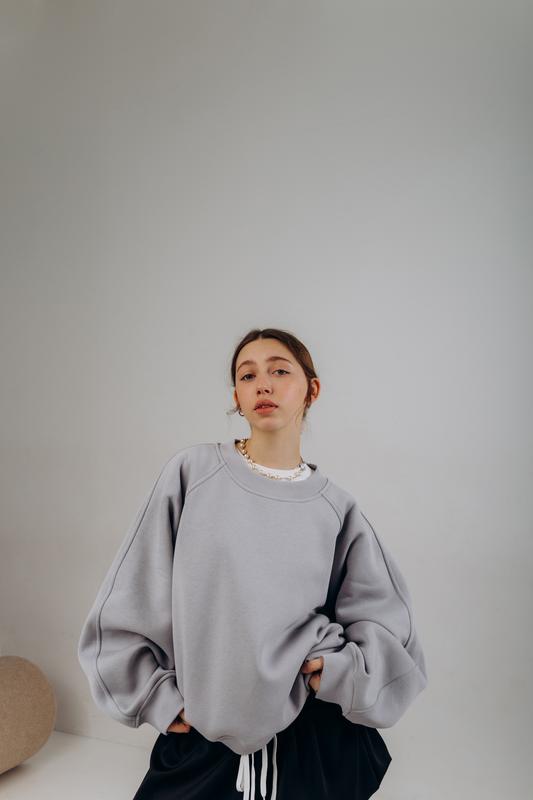 Світшот,світло сірого кольору,з теплої,якісної тканини,фасон реглан,виглядає обʼємне та стильно.