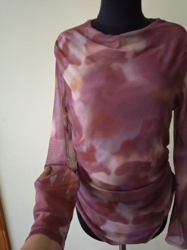 Полуобъем груди 42 см и тянется до 48 см. Рукава 64 см. Длина 54-68 см. Сеточка на рукавах, тело сеточка, но еще и на подкладке. Красивые пастельные тонка. Дефектов нет.