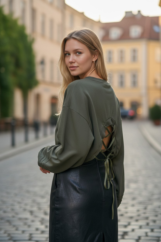 жіночий світшот оверсайз з декоративними строчками по плечам та низу рукавів, позаду шнурівка