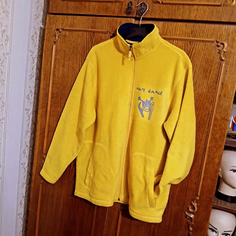 Брендовая модель по составу полиэстэр флис средней плотности С боковыми карманами, на молнии форнитура замка отличная рабочая с принтом рисунка лыжник и надписи на спине Дл.75 Пл.50 Р 63 Б по 25 Ог-Об 110-120.