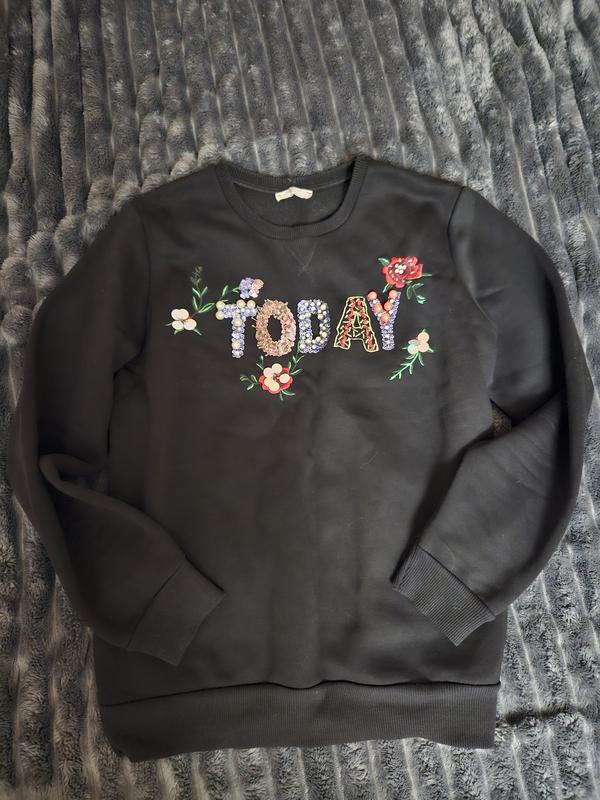 Свитшот женский черного цвета с шикарной вышивкой бисером. Есть маленький разрез по бокам. на флісі. размер Л. состав: 100% коттон длина изделия - 66 см длина рукава - от горловины 71 см, от плеча - 60 см полуобхват груди - 53 см, тянется до 59 см полуобхват талии - 52 см, тянется до 58 см.