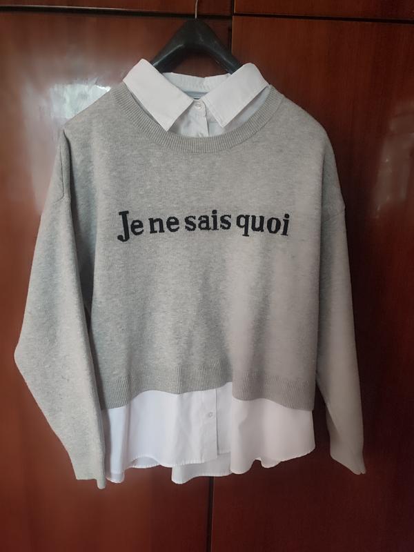 Серый джемпер-свитшот с воротником и надписью Je se sais quoi (2-в-1, кроп) Трендовый свитшот, имитирующий рубашку (воротник и низ). Употреблен, но без дефектов и в хорошем состоянии. Размер: L Замеры: * Ширина (полуобхват груди): 60 см * Рукав: 50 см * Длина общая: 75 см * Длина без воротника: 52-53 см Пишите, ответьте на все вопросы!