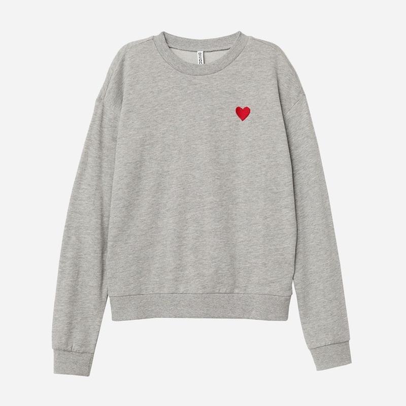 Жіночий сірий базовий вільний світшот з червоним вишитим серцем у розмірі S. Стан - ідеальний. Склад: 75% бавовна, 15% поліестер, 10% віскоза.