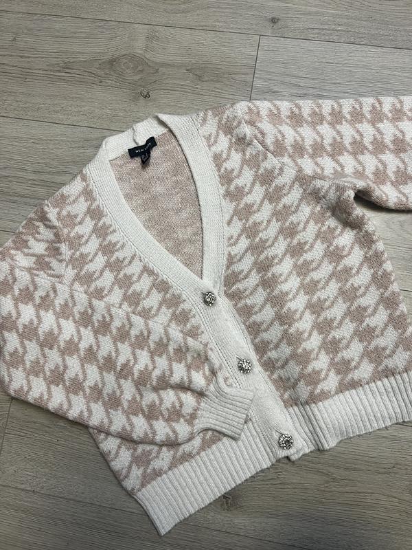 Размер S–M Состояние: очень красивое, без дефектов Мягкий, теплый и стильный кардиган с узором “гусиная лапка”. Имеет красивые декоративные пуговицы с камушками, выглядит женственно и элегантно. Идеально сочетается с джинсами, юбками или платьем.
