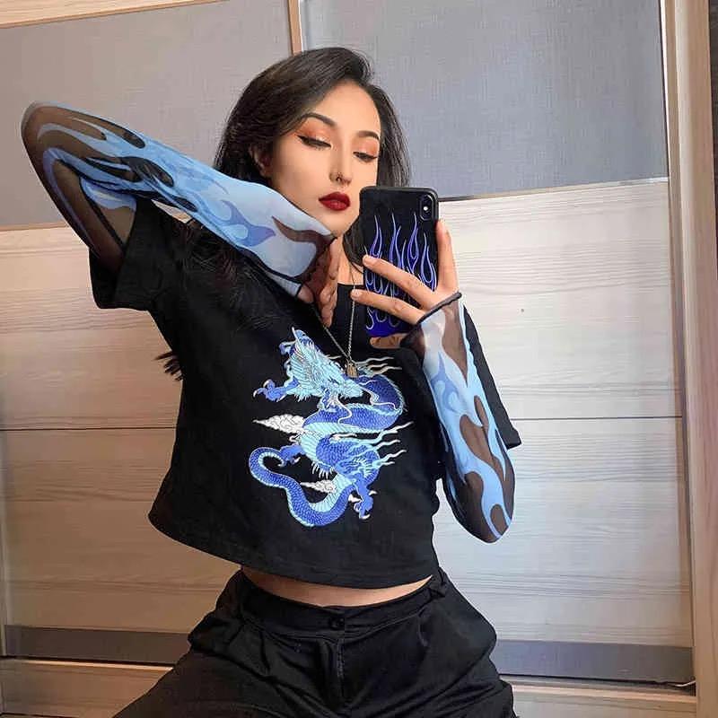 Укороченный свитшот с принтом «китайский дракон» и рукавами сеткой