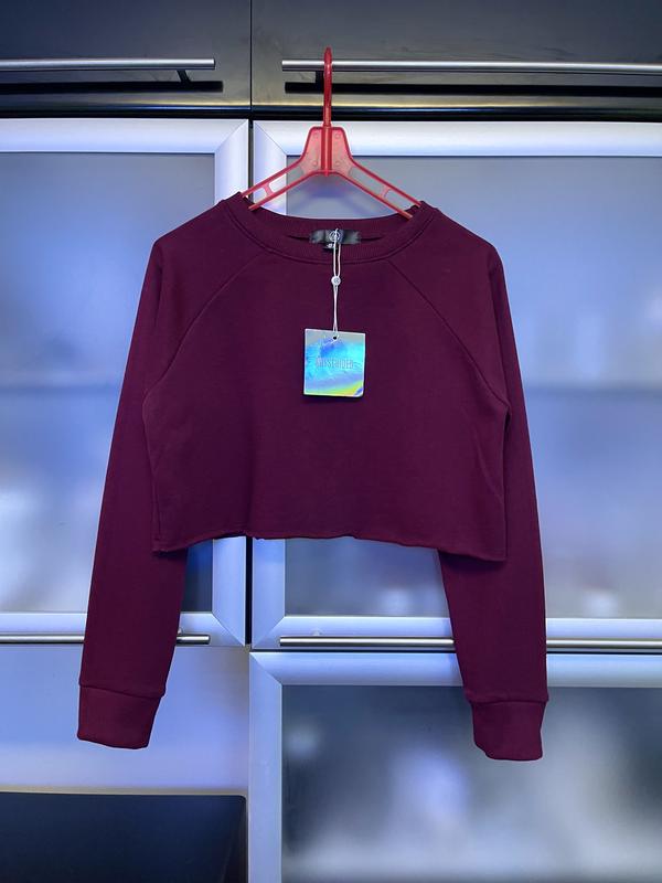 Missguided новий стильний укорочений світшот з мʼякої, приємної до тіла тканини красивого насиченого кольору-бургунд. Розмір з бірки 8/36. Довжина 35 см. Напів обхват грудей 45-53 см. Рукав 62 см, з під пахви 43 см. Котон 45% поліестер 55%.