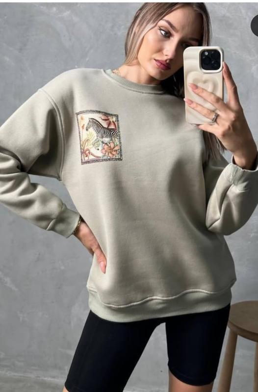 Комфортный теплый(на флисе) стильный свитшот. Цвет -оливковый.