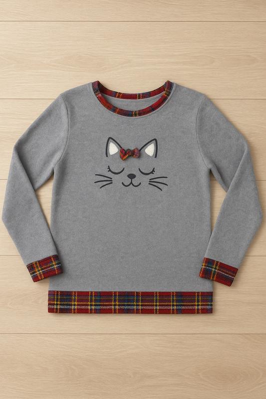 Продам м’який сірий світшот з милим вишитим котиком на грудях. • Колір: світло-сірий • Декор: вишитий котик із бантиком, яскраві картаті вставки на комірі, манжетах і по низу • Матеріал: м’який, приємний до тіла, добре тримає форму • Стан: чудовий, без плям і пошкоджень