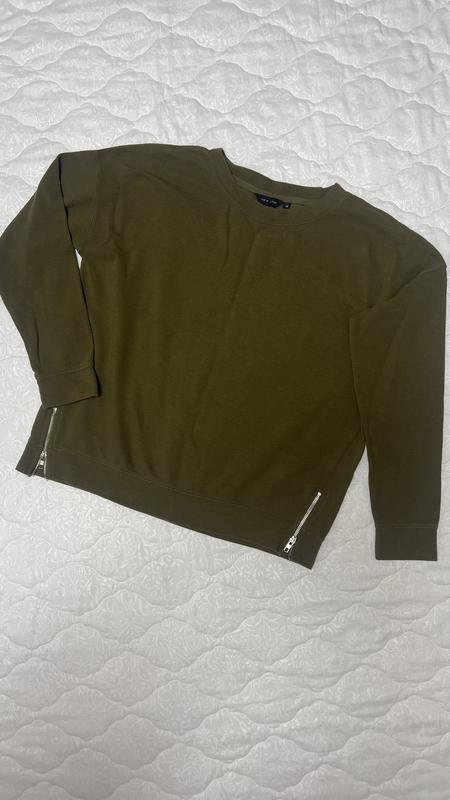 Жіночний світшот темно оливкового кольору. Є пляма на внутрішній стороні правого рукава, яка завдяки кольору виробу не дуже помітна (фото 3). Заміри по виробу: ПОГ - 59 Низ - 52 Плечі - 62 Рукав - 50 Довжина - 62