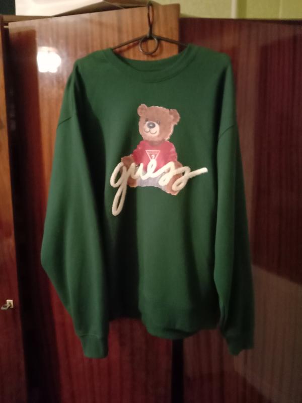 Свитшот унисекс зеленого цвета, с объемной надписью и мишкой, внутри на мягком флисе. Размер Л, крой оверсайз, подойдет для размера от М до Хл. Оделала пару раз, состояние новое