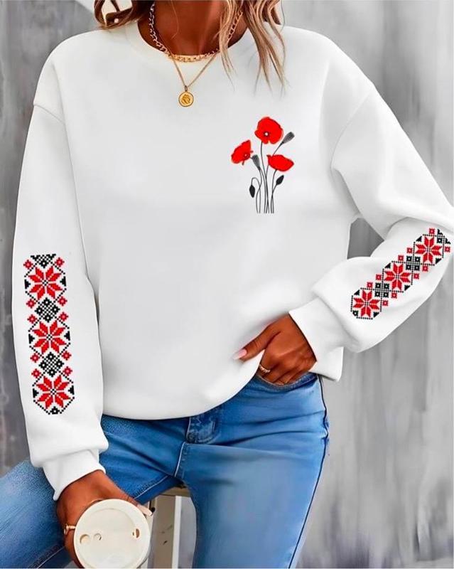 Світшот №746 розмір 42-46,48-52 тканина трехнитка на флісі колір білий теплий світшот зі спущеним плечем і манжетами на рукавах ОГ 42-46-114см,48-52-122см ОТ, ОБ 42-46-101см,48-52-109см Дов рукав 42-46-74см,48-52-75см Дов по серед спин 42-46-66см,48-52-69см