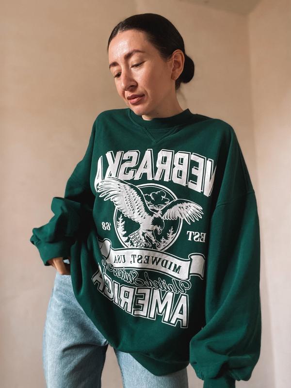 Світшот унісекс темно-зелений, з принтом “NEBRASKA, USA”. Зручний, теплий, вільного крою. Ідеальний для повсякденного стилю Розмір С/М вдягнуто на зріст 157 На утеплені
