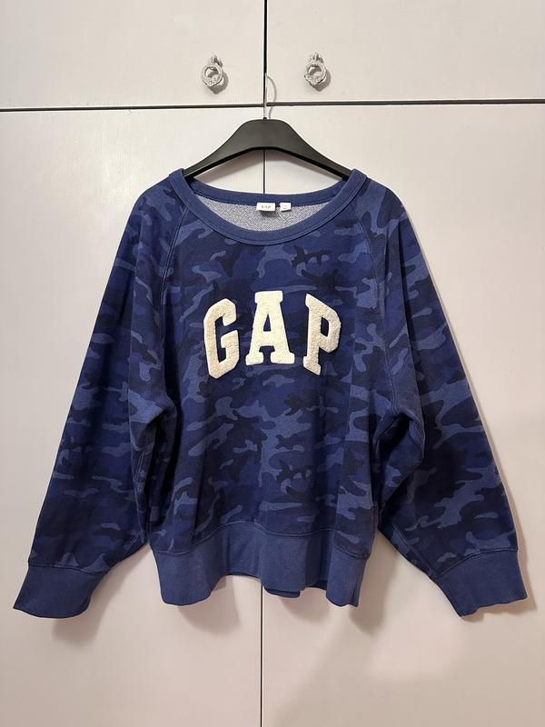 Світшот американського бренду Gap з стилізованим камуфляжним принтом синього коліру, логотипом бренду тедді та рукавами летюча миша. Розмір: L. Орієнтуйтесь на заміри, співставляйте з улюбленими речами. Довжина по спині 58 см, напівоб'єм під пахвами 59 см, напівоб'єм стегна 50 см. Склад: 60% бавовна, 40% поліестер. Сезон: осінь, весна - демісезон. Тканина приємна до тіла, плотність середня, ближче до тонкої. Оригінал Gap. Був у використанні, стан на фото. Усі види доставки.