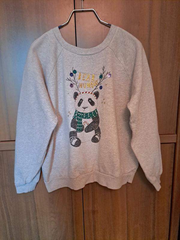 Женский свитшот светло серого цвета. Круглый вырез горловины, рукава реглан с манжетами, навороты с начесом. Симпатичный разноцветный принт по центру переда с рисунком, пайетками и маленькими стразами. Размер от производителя- L. Пог.- 61, длина- 63, длина рукава от горловины- 73см. 100% коттон. Шри- Ланка.