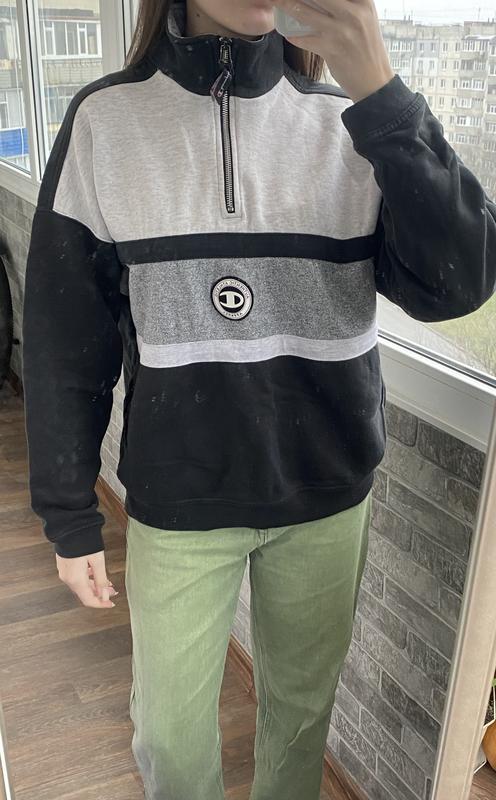 Світшот у розмірі М, вдягнутий на s. Чорного кольору, з горловиною, на застібці.Довжина рукава 40.