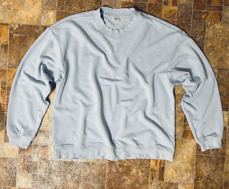 Голубой свитшот(можно носить как оверсайз Нежно-голубой цвет Пог 58 Низ 53 Рукав от горла 73 Длина 64 Бирка срезана Двунитка Состояние идеальное Все замеры в свободном положении Дополнительные фото и замеры по запросу Не кашлатится