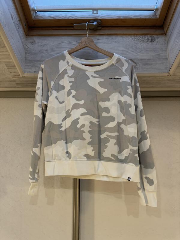 Світшот New Balance з камуфляжним принтом Оригінальний світшот бренду New Balance у світло-сірій камуфляжній палітрі. Виконаний з м’якого, приємного до тіла бавовни, добре тримає форму. Має класичний круглий виріз, рукави реглан та еластичні манжети на рукавах і по низу виробу. Лаконічний логотип New Balance розміщений на грудях. Силует — комфортний, трохи вільний, ідеально підходить для повсякденних образів, подорожей або athleisure-стилю. Легко поєднується з джинсами, спортивними штанами чи спідницями. Стан: дуже хороший Бренд: New Balance Колір: сірий / молочний камуфляж Посадка: комфортна, не облягаюча