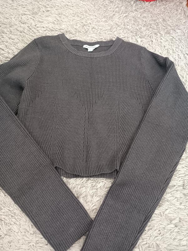 Красивий топ-кроплонгслвв з довгим рукавом,цупка тканина,тягнеться з невеличким декором спереду хвилі,колір не чорний,а темно сірий,дуже гарно лягає по фігурі,розмір М.