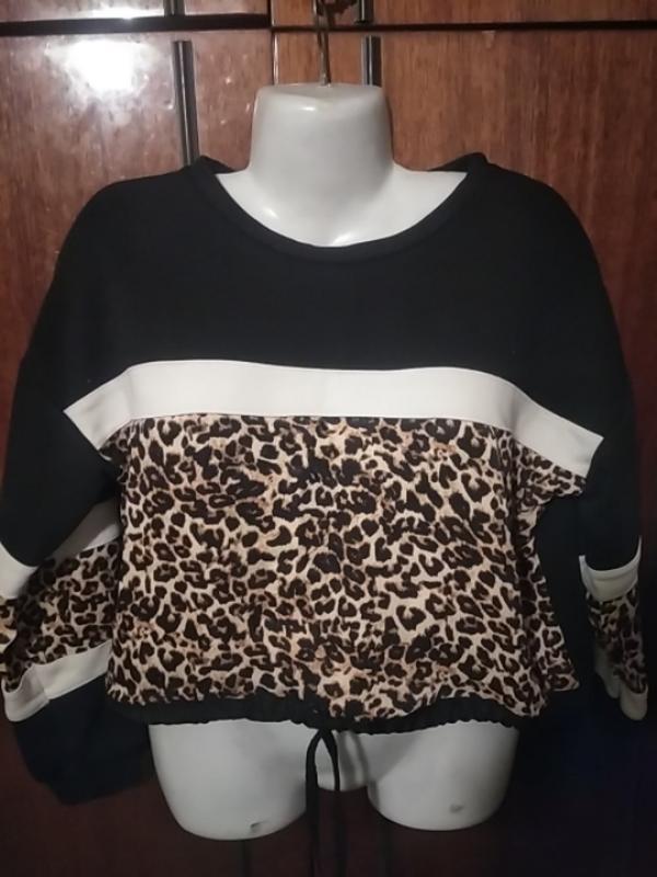 укороченный свитшот 38 евро в хорошем состоянии без нюансов,низ стягивается,сделан в Турции, сзади ,рукава и верх переда сделан из утепленной ткани на х/б основе, на фото утепленную изнанку показала, спереди вставка леопардовая из полиэстера, внизу стягивается по талии кулиской, на бирке 38 размер, это 46 украинский, на 46 будет оверсайз, подойдет по замерам и на 48-50-52 укр. размер, смотрите точные замеры:пог 57-58 см + тянется до 60 см, по низу,по талии пот 55-56 см, можно стягивать кулиской, длина рукава от горловины 71 см, длина по спинке 48 см, укороченная, до талии длина