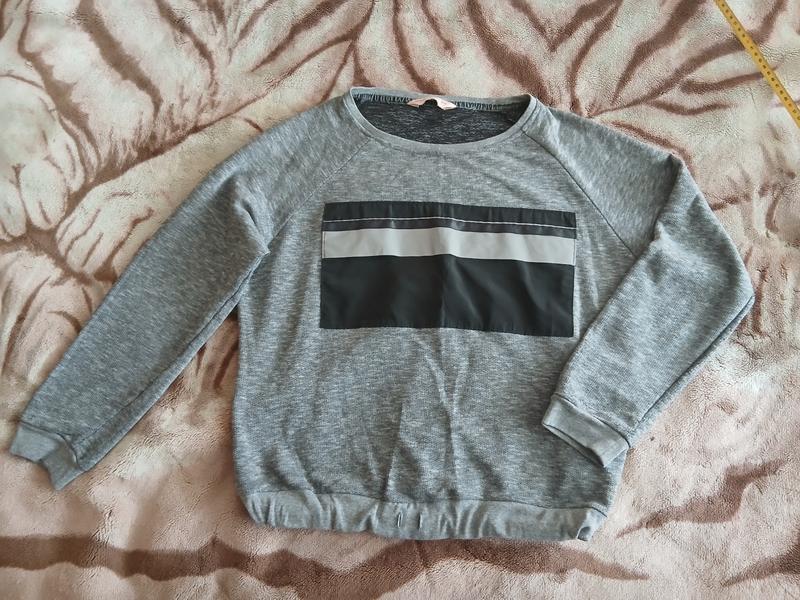 серый свитшот, не растягивающий и не косматый, имеет светоотражающие элементы на груди, снизу есть резинка поэтому можно делать короче, за счет свободного кроя подойдет на несколько размеров, замеры на фото.