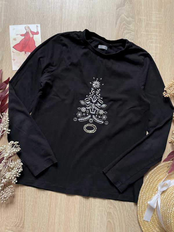 Натуральна котонова кофтинка, базова в чорному кольору З новорічним мотивом, має зображення ялинки з вишивки та стразів Розмір дитячий, добре підійде на xs-xxs Пог 39 Пот 39 Довжина 52 Рукав 52