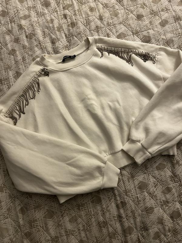 Світшот на флісі Дуже красивий білого кольору оздоблений цепочками з камінцями , виглядає дуже стильно та додає до повсякденного одягу нарядності та святкового настрою. Плечики пошито приспущеними . Укорочена довжина . Жодних дифектів . Розмір S