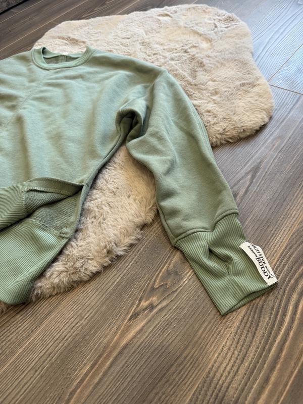 Стильний світшот в актуальному відтінку шавлієвого зеленого 🌿 Модель вільного крою з лаконічним дизайном і бічними розрізами, які додають образу легкості та сучасності. Класичний круглий виріз, еластичні манжети та широкий нижній пояс забезпечують комфортну посадку й охайний вигляд. Світшот виготовлений з м’якого, приємного до тіла матеріалу, добре тримає форму та підходить для щоденного носіння. Легко поєднується з джинсами, легінсами чи спортивними штанами — ідеальний варіант для casual та athleisure образів. Переваги: вільний крій стильні бокові розрізи, також «напальчики» м’яка та щільна тканина універсальний колір комфортний для будь-якої пори року Розмір універсальний до розміру L