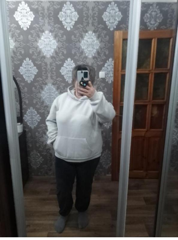 свитшот теплый хорошо размера на спине вибито очень красиво , цвет светло серый , длина 70см , пог 80 см и тянется до 90 см , резинка 70 см и тянется до 85 см это полу обх.рукав от шеи 89 см , он носится овером .качество отличное .