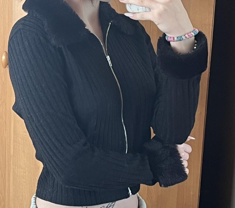 Чорна укорочена кофта на блискавці з коміром-стійкою. Тканина фактурна. Рукави з м’яким, пухнастим ворсом (дуже приємні на дотик), манжети також м’які. По талії еластична, красиво сідає по фігурі.