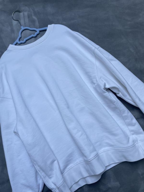 Колір: Білий. Фасон: Оверсайз, з довгими рукавами та круглим вирізом горловини. Матеріал: бавовна або суміш бавовни з іншими волокнами. Особливості: Присутні манжети на рукавах та внизу виробу.