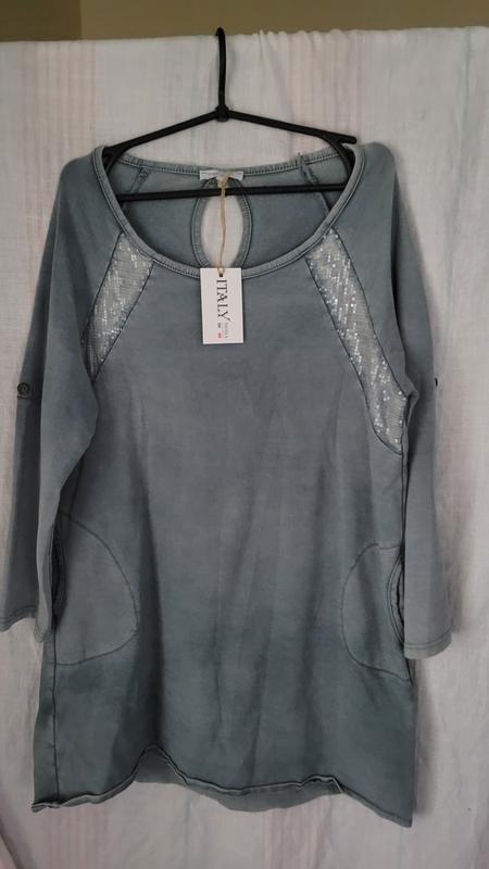 длинный свитшот с боковыми карманами, рукав- реглан,на груди поетки, ткань вываренная сероголубая,ог и об 108+, рукав от ворота 65, длина 85.