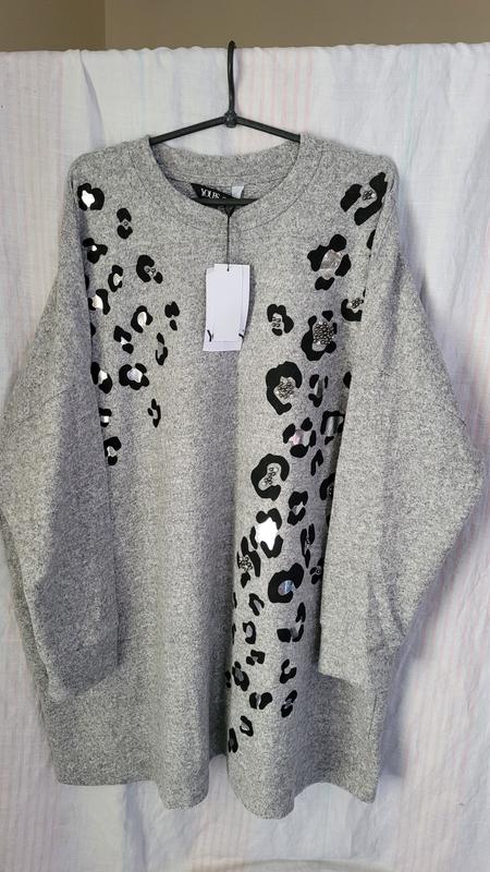 длинный нарядный свитшот оверсайз, плечо спущено, украшен стразами и серыми бусинками, на ощупь мягкий как велюр, ог и об 150+, рукав от ворота 78, длина 86.