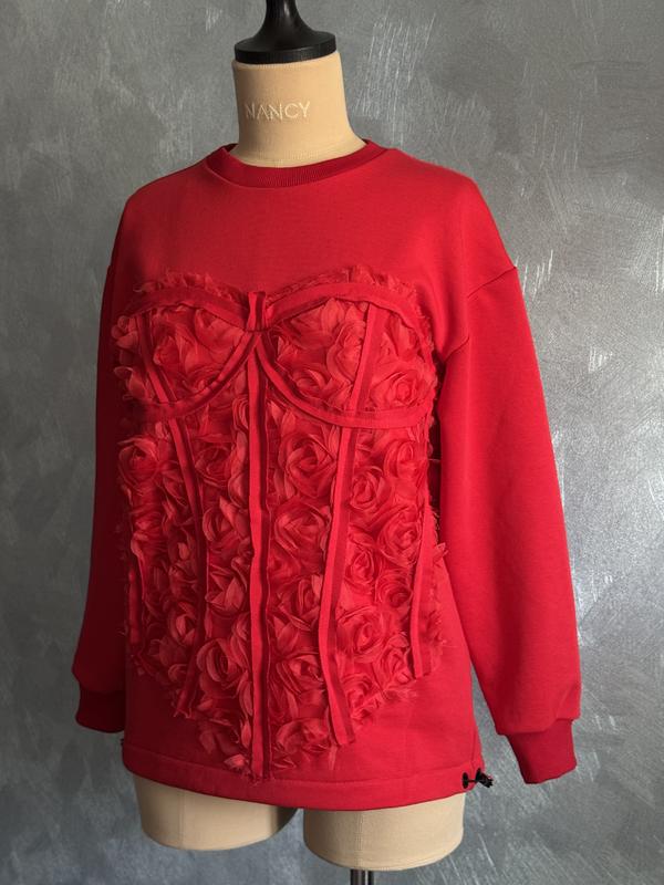 В наявності світшот не утеплений Помірного обʼєму По низу утяжка По грудях 52 Довжина рукава від горла з манжетою 69 Довжина по спині 70