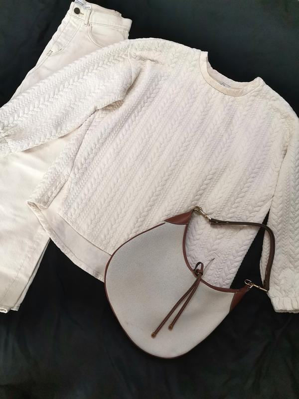 Классный, плотный, красиво держит форму, комфортный, есть бушансы в виде поямок (фото) указанный размер L, но носила на С, как оверсайз