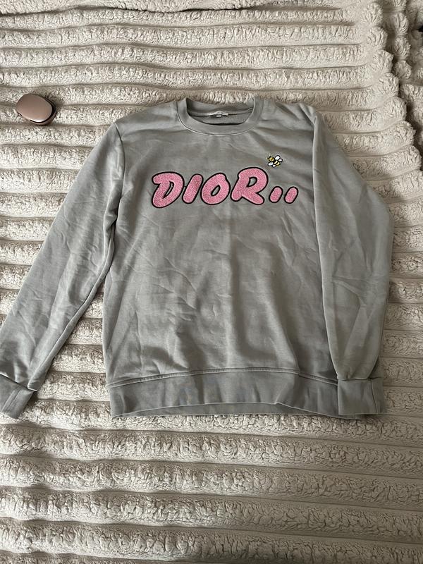 світшот із колаборації Christian Dior x KAWS. Модель прикрашена вишитим логотипом "DIOR" у стилі KAWS та характерним символом бджілки (Bee Accent) на грудях. Основні характеристики: Дизайн: Світшот з круглим вирізом горловини та довгими рукавами. На передній частині розміщено великий текстовий логотип "DIOR" рожевого кольору з чорним контуром та невелике зображення бджілки над ним. Матеріал: Виготовлений з бавовни. Колекція: Випущено в межах співпраці з художником KAWS для сезону 2019 року.