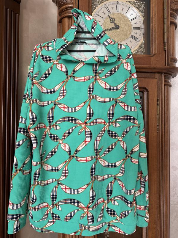 Колір в реальності більш яскравий,насичений зелений. Цікавий принт під бренд"Барбері" Легкий,яскравий,гарно тягнеться. Без дефектів,без слідів носіння. Бірки зі складом нема, та схоже поліестер+еластан Довж-75 Плечі з рукавом від горловини-80 Ног-65/75 Нот-55/65 Ноб-54/64