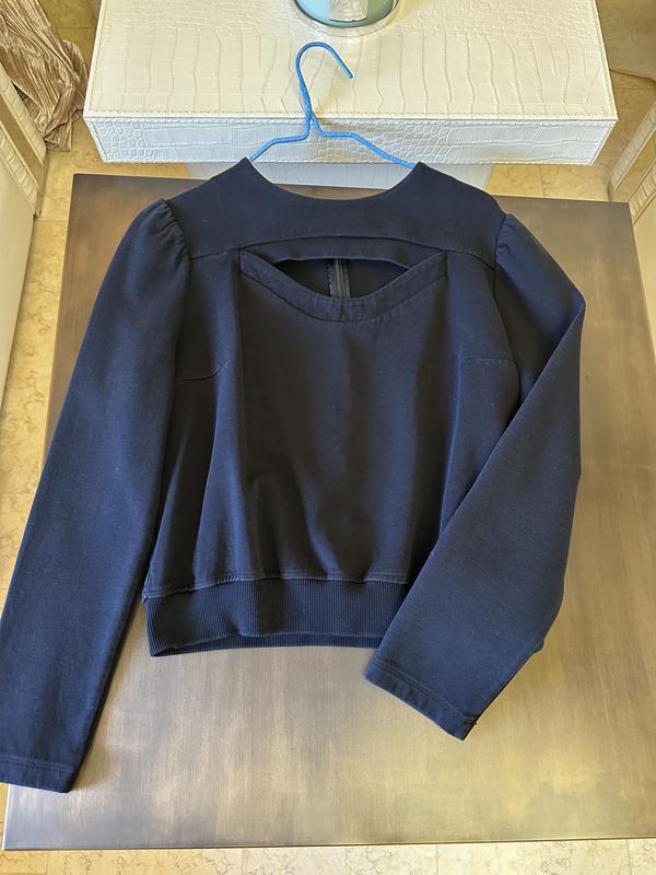 Свитшот Carven Оригинал Размер L- М В хорошем состоянии Стильная укороченная модель Глубокий чёрный цвет Плотный качественный трикотаж, хорошо держит форму Красивый дизайнерский вырез на спинке Аккуратные плечи с лёгкой сборкой Застёжка на молнии сзади Низ на эластичной резинке Состав: 89% cotton, 11% polyamide Смотрится очень эффектно и необычно, легко комбинируется с брюками, джинсами или юбками