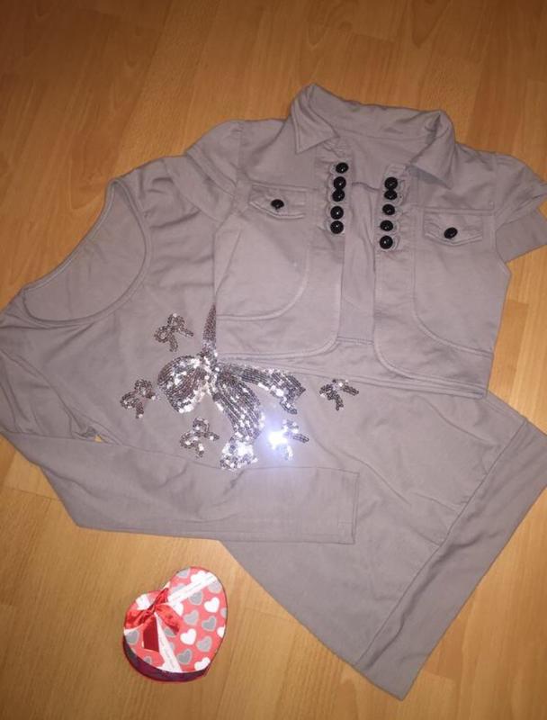 Набір з кофти-туніки та балеро! Можна носити окремо. Хороша якість! Без дефектів! Всі пайєтки на місці!} Колір тепло-сірий. Розмір S. Заміри: П/о плечі -33 см П/о груди - 35 см П/о бедра - 38 см Довжина туніки - 66 см Довжина балеро - 36 см Довжина рукава від плеча - 57 см